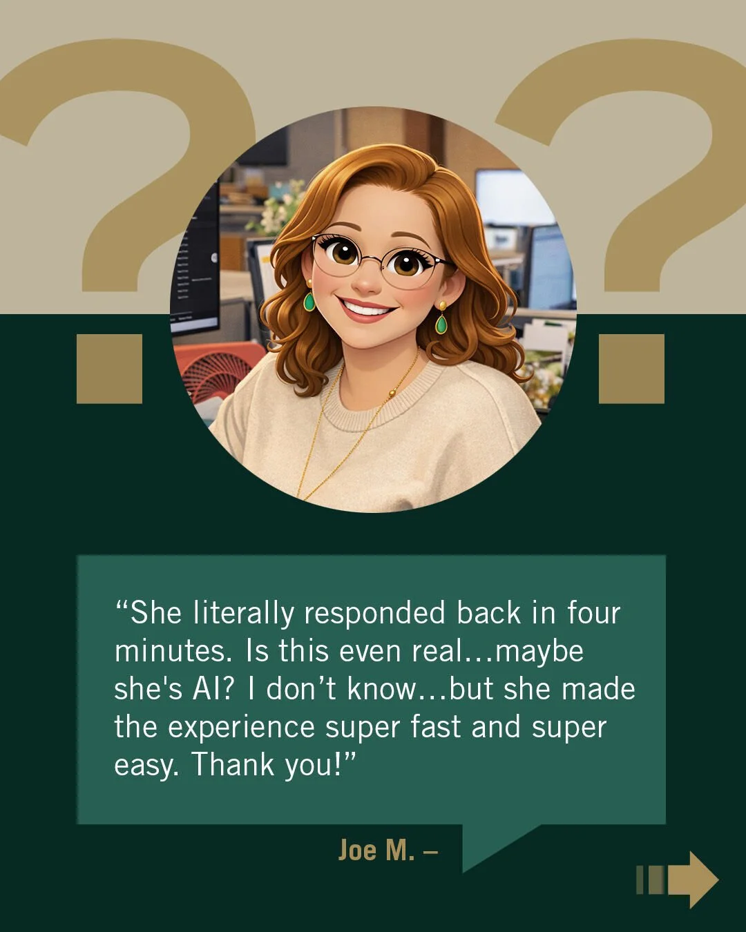 “She literally responded back in four minutes. Is this even real…maybe she’s AI? I don’t know…but she made the experience super fast and super easy. Thank you!”